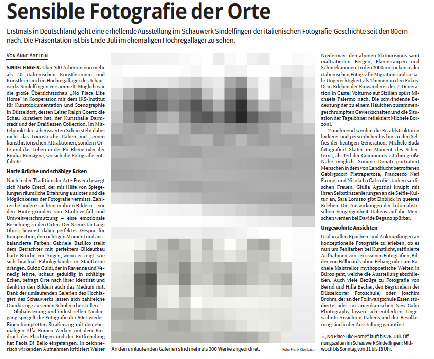 Nach dem großen Erfolg der Ausstellung "NO PLACE LIKE HOME. Italienische Fotografie seit den 1980er Jahren" in der Kunsthalle Darmstadt, die vom Leiter des IKS, Ralph Goertz, kuratierte wurde, schwärmt auch die Stuttgarter Presse von der Präsentation im SCHAUWERK Sindelfingen.